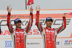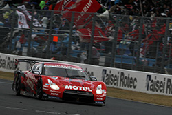 在預賽中名列第3的#24 D'station ADVAN GT-R賽車(安田裕信/Michael Krumm)在決賽日早上(當時跑道已變干)的自由行駛中獲得第2名的成績。其有望在比賽中獲得好成績。雖然起步較晚,Michael Krumm的排位出現(xiàn)下降,但在后半程賽事中接手賽車的安田裕信有望挽回頹勢。但是安田裕信在交接賽車后的外圈中卻令人遺憾地遭遇賽車打滑事故,導致失去爭奪勝利的寶貴時間,最終以第13名的成績沖過終點。在預賽中名列第7的#12 CALSONIC IMPUL GT-R賽車(松田次生/Jo?o Paulo de Oliveira)由松田次生負責前半程賽事,與Jo?o Paulo de Oliveira交接賽車時成績處于第5位。雖然溫度降低的輪胎轉(zhuǎn)暖過程中排位下降兩位,但在比賽最后階段與#39 SC430賽車的爭奪陷入白熱化,從而博得觀眾的陣陣掌聲。最終順利將名次提升至第6位并沖過終點。Jo?o Paulo de Oliveira表示:“與#39Lexus賽車的爭奪中我們干得十分漂亮,因此感到非常高興。我們將排位提升1位同時收獲了積分,我認為這是一個令人滿意的結(jié)果?!?/span>