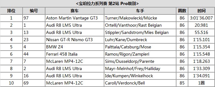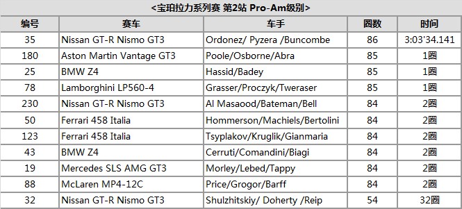 在剩余的GT-R賽車中,Buncombe出場(chǎng)負(fù)責(zé)剩余的賽事,最終在毫無(wú)威脅的狀態(tài)下走完全程,最終獲得綜合成績(jī)第10名,并在Pro-Am級(jí)別中奪魁。