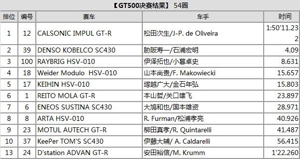 決賽的熱身圈在下午4時舉行,跑1圈后進行動態(tài)發(fā)車。確定好各車的發(fā)車順序后,各賽車紛紛沖至第一彎道。12# GT-R賽車的首發(fā)車手是松田次生。處于領(lǐng)先位置的松田次生一邊觀察后方賽車的情況一邊采取穩(wěn)健的策略。決賽的熱身圈在下午4時舉行,跑1圈后進行動態(tài)發(fā)車。確定好各車的發(fā)車順序后,各賽車紛紛沖至第一彎道。12# GT-R賽車的首發(fā)車手是松田次生。處于領(lǐng)先位置的松田次生一邊觀察后方賽車的情況一邊采取穩(wěn)健的策略。雖然松田次生采取穩(wěn)步前進的策略,但在第18圈時不小心給予對手可乘之機,從而丟失了頭名。但是,在第25圈進站維修與Oliveira交接賽車之后,由于18# HSV賽車駛出維修站再次發(fā)動時耗費了較多時間,12# GT-R賽車再次成為領(lǐng)頭羊。之后Oliveira保持穩(wěn)健的節(jié)奏,再沒給對手超越的機會,在第54圈時率先沖過終點。