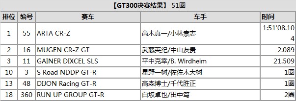 另外,Quintarelli駕駛23# MOTUL AUTECH GT-R賽車(柳田真孝/RonnieQuintarelli)以預賽第9名的成績起步,一直保持穩(wěn)定的節(jié)奏,逐漸將排位上升,進入第9圈時排位一度攀升至第6位。第24圈即將進入維修站之前,與前方37# SC430賽車之間只有約12秒的差距。NISMO車隊的后勤維修人員深受Quintarelli拼搏精神的鼓舞,迅速開展維修作業(yè)將完成賽車交接的柳田真孝送出維修區(qū),因此成功填補上述12秒的差距一舉逆轉(zhuǎn)。但是,在交接賽車之前由于與1# GT-R賽車發(fā)生剮蹭,被處以駕車通過維修區(qū)的處罰,因此損失了大量時間。雖然之后柳田真孝謹慎駕車不出絲毫差錯,但已難以挽回時間損失,最終以第9名的成績沖過終點。以預賽第14名的成績起步的24#D'station ADVAN GT-R賽車(安田裕信/Michael Krumm)最終獲得第13名。在GT300級別比賽中,3# S RoadNDDP GT-R賽車(星野一樹/佐佐木大樹)以預賽第17名的成績起步,最終以第10名獲得NISSANGT-R NISMO GT3最好的成績,成功收獲了積分。
