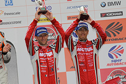 另外,Ronnie Quintarelli以預(yù)賽第11名的成績(jī)駕駛#23 GT-R起步。在前半程賽事中,持續(xù)與#24 GT-R展開激烈競(jìng)爭(zhēng),因此加速了輪胎的磨損。在第19圈的彎道頂點(diǎn)中一舉超越#24 GT-R,使得排位上升至第8位。在第30圈時(shí)為交接賽車和更換輪胎,Ronnie Quintarelli駕駛賽車進(jìn)入維修站。柳田真孝駕駛賽車重返賽道后,由于前方賽車剮蹭等導(dǎo)致某些情況變動(dòng),另外加上降雨,使得賽道出現(xiàn)混亂情況。盡管如此,順利跑圈的#23 GT-R一鼓作氣將排位提升至第6位。在臨近賽事結(jié)束時(shí),由于處于第一集團(tuán)的賽車出現(xiàn)打滑等現(xiàn)象導(dǎo)致掉隊(duì),#23 GT-R在第81圈時(shí)奮勇沖過終點(diǎn),最終奪得第3名。另外,以預(yù)賽第9名的成績(jī)起步的#24 D'station ADVAN GT-R(安田裕信/Michael Krumm)由安田裕信擔(dān)任首發(fā)車手,安田裕信一直保持穩(wěn)定的節(jié)奏堅(jiān)守排位,在第30圈進(jìn)站維修時(shí)與Michael Krumm進(jìn)行了賽車交接。Michael Krumm負(fù)責(zé)較長賽道(負(fù)責(zé)圈數(shù)),最終奪得第5名。他感慨地說:“比賽臨近尾聲時(shí)下雨,我駕車進(jìn)站維修并更換了輪胎,面對(duì)半濕的路面輪胎充分發(fā)揮了性能,最終我以第5名的成績(jī)完成比賽,感覺很好?!?/span>