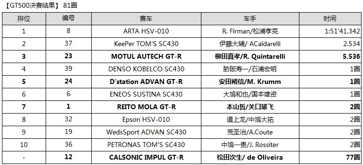在上次雪邦賽事中奪冠的#12CALSONIC IMPUL GT-R(松田次生/Joao Paulo de Oliveira)由松田次生擔(dān)任首發(fā)車手,駕駛賽車以預(yù)賽第14名的成績(jī)起步。起步不久,在第5圈時(shí)賽車的驅(qū)動(dòng)系統(tǒng)出現(xiàn)故障,感覺不妙的松田次生被迫駕駛賽車進(jìn)站維修。但是,在最后彎道向維修道進(jìn)發(fā)的中途,事態(tài)變得惡化起來。最終賽車停下來未能返回維修站,被迫退出比賽。