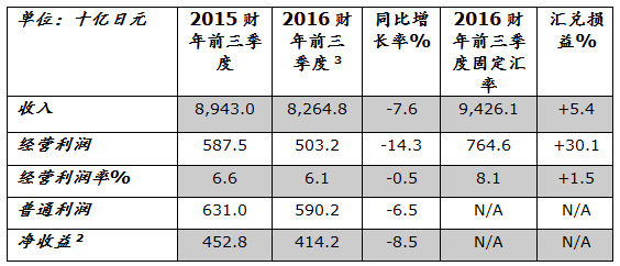 日產(chǎn)汽車公司2016財(cái)年前三季度主要財(cái)務(wù)信息